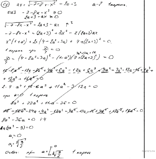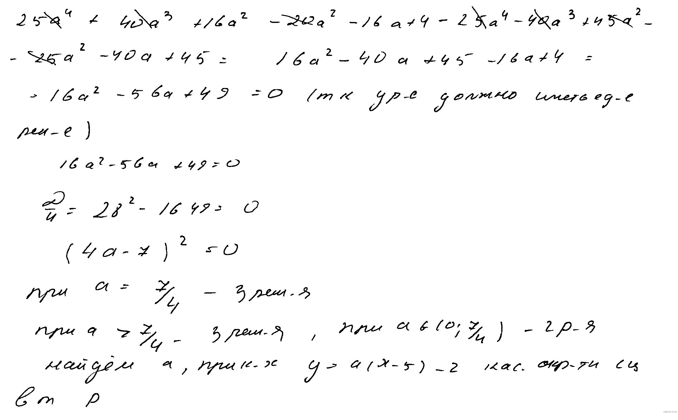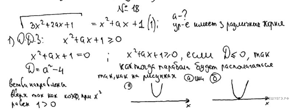| Решение содержит: − или верное описание расположения двух лучей и прямой из условия задачи; − или верное получение квадратного уравнения с параметром a относительно одной из переменных | 1 |
