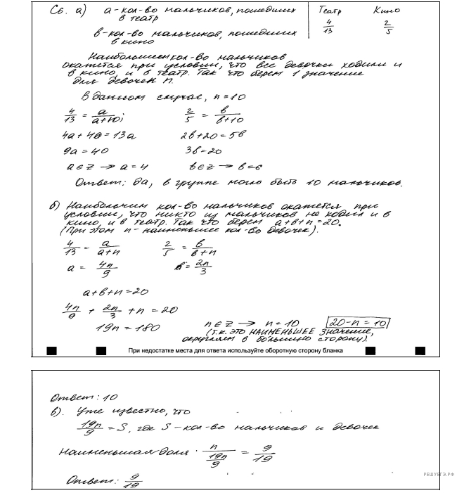 в) Предположим, что некоторый мальчик сходил и в театр, и в кино. Если бы вместо него в группе присутствовало два мальчика, один из которых посетил только театр, а другой — только кино, то доля мальчиков и в театре, и в кино осталась бы прежней, а общая доля девочек стала бы меньше. Значит, для оценки наименьшей доли девочек в группе можно считать, что каждый мальчик сходил или только в театр, или только в кино.
