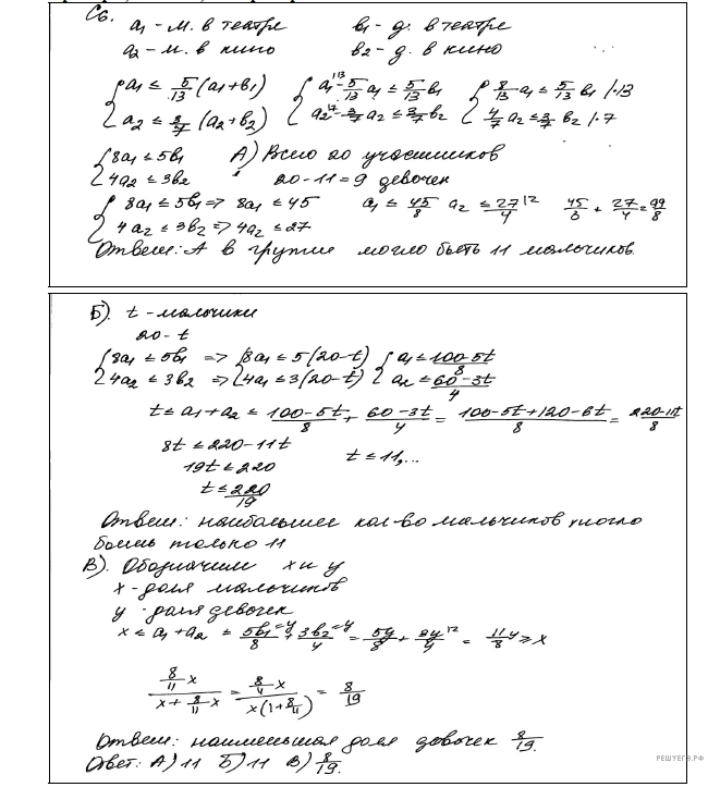 б) Предположим, что мальчиков было 11 или больше. Тогда девочек было 9 или меньше. Театр посетило не более 4 мальчиков, поскольку если бы их было 5 или больше, то доля мальчиков в театре была бы не меньше что больше
