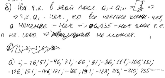 б) Поскольку 3, 5 и 25 — нечётные числа, любые два соседних члена последовательности имеют разную чётность. На нечётных местах должны стоять нечётные числа, а на чётных — чётные. Число 235 нечётное, поэтому оно не может стоять на чётном месте. Значит, последовательность не может состоять из 1000 членов.