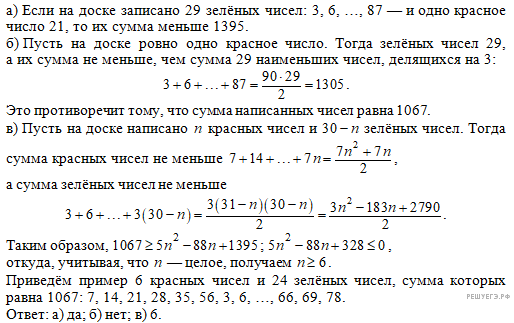 б) Поскольку задуманные числа натуральные, то наименьшее число в наборе — это наименьшее из задуманных чисел, а наибольшее число в наборе — это сумма всех задуманных чисел. Среди чисел записанного набора должна быть сумма всех чисел, кроме наименьшего, то есть 22 – 1 = 21. Но этого числа нет в наборе, поэтому не существует примера таких задуманных чисел, для которого на доске будет выписан набор из условия.
