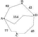 Из пункта A в пункт D ведут три дороги. Через пункт B едет грузовик со средней скоростью 62 км/ч, через пункт C едет автобус со средней скоростью 52 км/ч. Третья дорога — без промежуточных пунктов, и по ней движется легковой автомобиль со средней скоростью 56 км/ч. На рисунке показана схема дорог и расстояние между пунктами по дорогам.