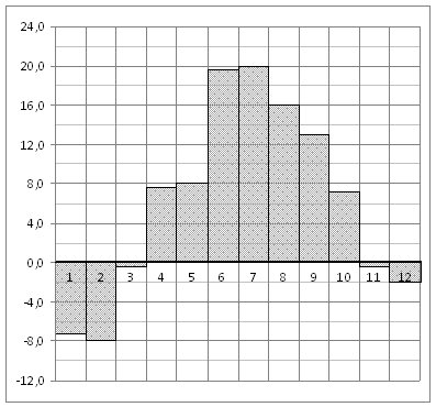 Из диаграммы видно, что наименьшая среднемесячная температура составляет −14 °C (см. рис.).
