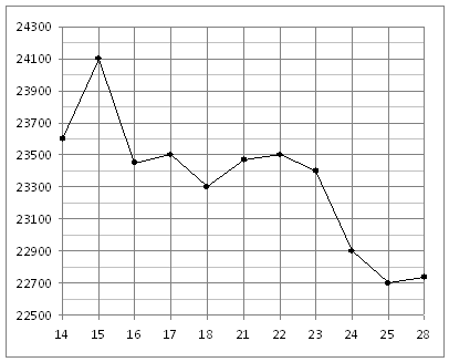 На ри­сун­ке жир­ны­ми точ­ка­ми по­ка­за­на цена олова на мо­мент за­кры­тия бир­же­вых тор­гов во все ра­бо­чие дни с 14 по 28 июля 2008 года. По го­ри­зон­та­ли ука­зы­ва­ют­ся числа ме­ся­ца, по вер­ти­ка­ли  — цена тонны олова в дол­ла­рах США. Для на­гляд­но­сти жир­ные точки на ри­сун­ке со­еди­не­ны ли­ни­ей. Опре­де­ли­те по ри­сун­ку раз­ность между наи­боль­шей и наи­мень­шей ценой олова на мо­мент за­кры­тия тор­гов в ука­зан­ный пе­ри­од (в дол­ла­рах США за тонну).