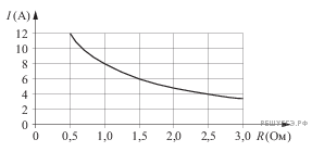 Мощность отопителя в автомобиле регулируется дополнительным сопротивлением, которое можно менять, поворачивая рукоятку в салоне машины. При этом меняется сила тока в электрической цепи электродвигателя – чем меньше сопротивление, тем больше сила тока и тем быстрее вращается мотор отопителя. На рисунке показана зависимость силы тока от величины сопротивления. На оси абсцисс откладывается сопротивление (в омах), на оси ординат – сила тока в амперах. Ток в цепи электродвигателя уменьшился с 12 до 6 ампер. На сколько омов при этом увеличилось сопротивление цепи?