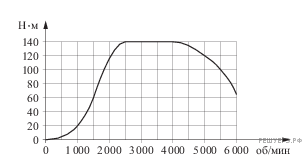 На графике изображена зависимость крутящего момента двигателя от числа его оборотов в минуту. На оси абсцисс откладывается число оборотов в минуту, на оси ординат — крутящий момент в Нм. На сколько Н