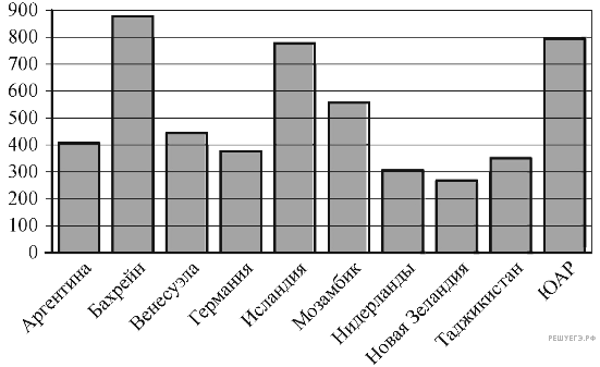 Версия для печати и копирования в MS WordНа диаграмме показано распределение выплавки алюминия в 10 странах мира (в тысячах тонн) за 2009 год. Среди представленных стран первое место по объёму выплавки занимал Бахрейн, десятое место — Новая Зеландия. Какое место среди представленных стран занимал Мозамбик?