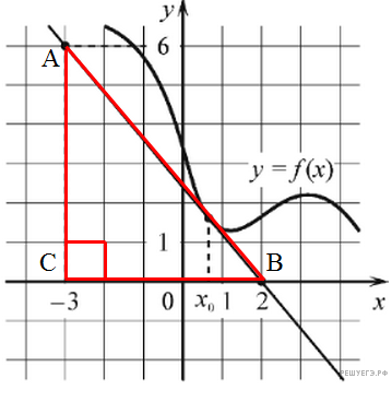 Значение производной в точке касания равно угловому коэффициенту касательной, который в свою очередь равен тангенсу угла наклона данной касательной к оси абсцисс. Построим треугольник с вершинами в точках A (−3; 6), B (2; 0), C (−3; 0). Угол наклона касательной к оси абсцисс будет равен