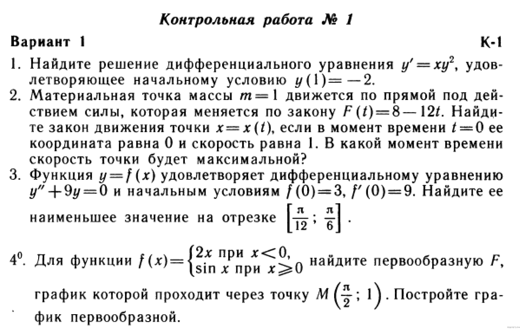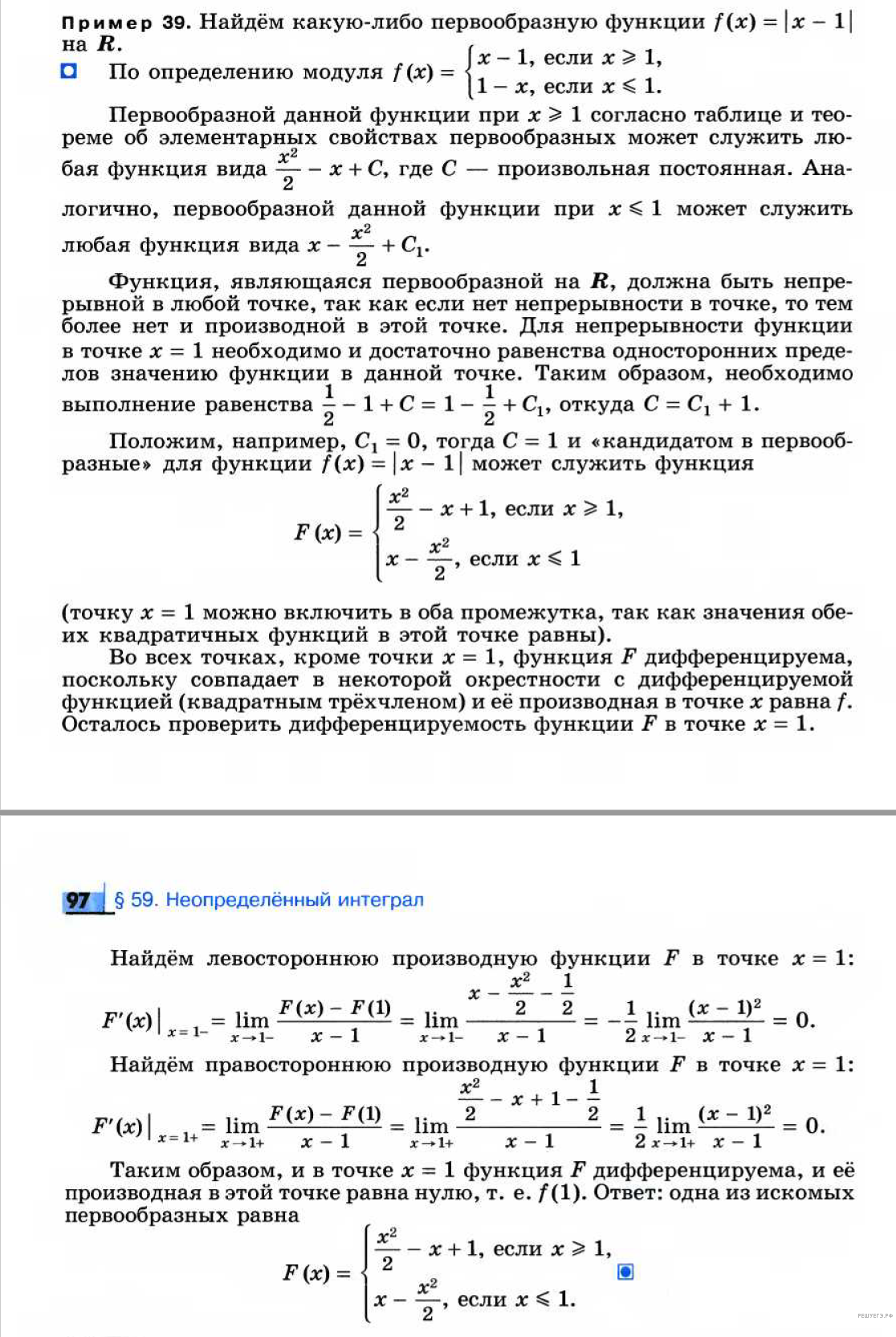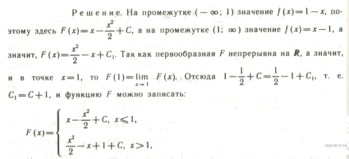 Более простая задача приводится с решением в пособии Саакяна С. М. и др. Задачи по алгебре и началам анализа для 10–11 классов: необходимо найти общий вид первообразных функции К сожалению, приведенное авторами решение (см. ниже) нельзя признать полностью удовлетворительным, поскольку в нем не проверяется дифференцируемость найденной первообразной в точке 1. Предостерегаем читателя от этой ошибки.