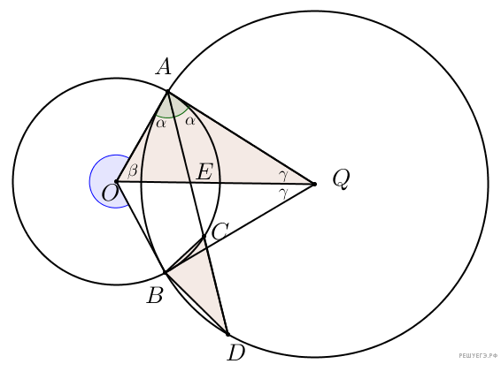 а) Проведем дополнительно отрезки OB и BQ: треугольники OAQ и OBQ равны по 3 сторонам (OA = OB = r, QA = QB = R, OQ — общая). Отсюда следует равенство углов: Вписанный угол BDA опирается на ту же дугу BA, что и центральный угол AQB. Тогда