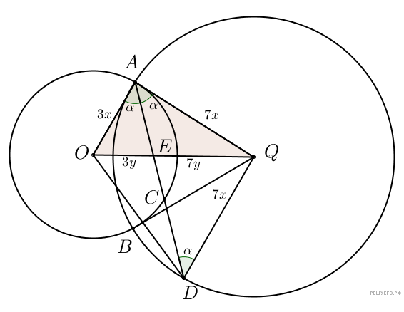 Из основного свойства биссектрисы в треугольнике получаем: AO : OE = AQ : EQ, откуда можем записать, что OE = 3y, EQ = 7y.