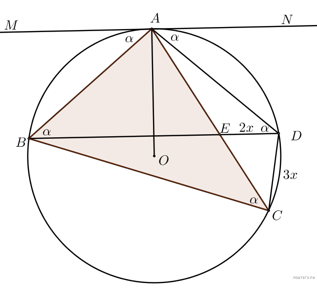 а) Угол между касательной и хордой равен вписанному углу, который опирается на эту хорду. Поэтому ∠MAB = ∠BDA = ∠BCA = α так как прямые MN и BD параллельны, то ∠MAB = ∠ABD = α, как накрест лежащие. Отсюда получаем, что ∠ABD = ∠ADB = α, то есть треугольник ABD — равнобедренный (тогда AB = AD). Что и требовалось доказать.