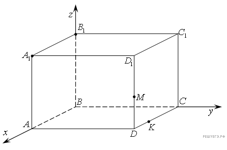 Поместим заданный куб в декартову систему координат, как показано на рисунке. Пусть М — середина ребра DD1, K — середина ребра DC. Тогда: A1 (4; 0; 4), B1 (0; 0; 4), M (4; 4; 2), K (2; 4; 0).