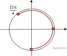 б) Мы ищем корни, расположенные в четвертой, первой четвертях и первой половине второй четверти единичной окружности. В четвертой четверти расположен единственный корень который получается из серии корней