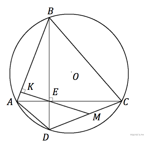 а) углы ∠BDC и ∠BAC равны, так как они опираются на одну и ту же дугу BC. Тогда в треугольнике ABE угол ∠ABE = 30° (так как ∠BAC = 60°). Обозначим точку пересечения прямой ME со стороной AB за K. Тогда в прямоугольном треугольнике BKE угол ∠BEK = 60°. Далее, ∠BEK = ∠MED = 60° (как вертикальные). Отсюда получаем, что — равносторонний (так как все углы по
