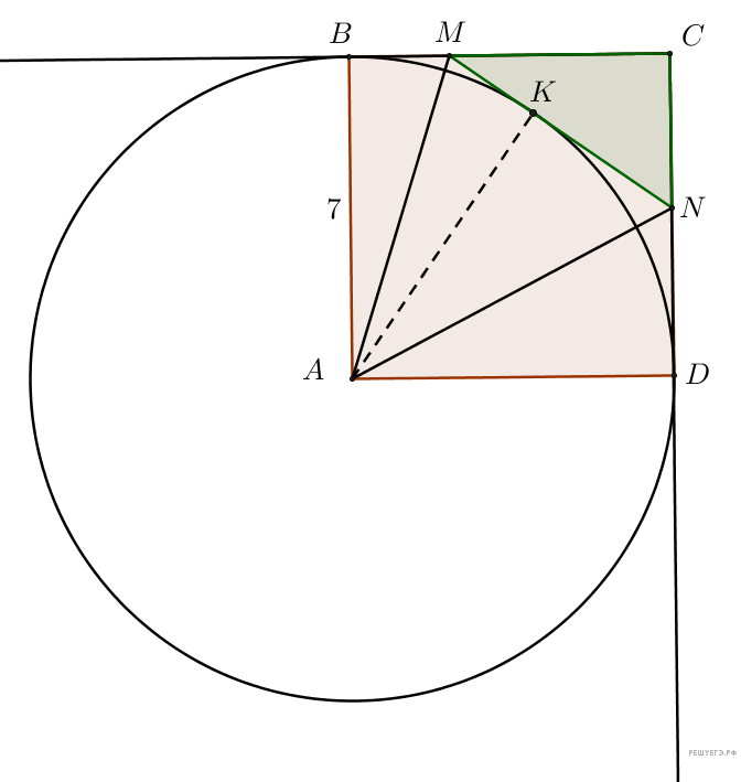 а) Построим чертеж, который должен получиться в результате, и докажем, что он верен. Введем следующие обозначения: CM = a, CN = b, MK = x, KN = y. Так как отрезки касательных, проведенные из одной точки, равны, то, во-первых, MB = MK = x, ND = KN = y. Во-вторых, CB = CD, откуда: CB = CM + MB = a + x, CD = CN + ND = b + y, то есть a + x = b + y. Далее, периметр треугольника CMN равен 14, то есть a + b + x + y = 14. Подставляя сюда a + x из предыдущего равенства, получим 2(b + y) = 14, откуда b + y = 7. Следовательно, и a + x = 7. Отсюда получили, что CB = CD = 7 (что совпадает с длиной стороны квадрата), то есть точки B и D действительно являются точками касания. Тогда так как касательная перпендикулярна радиусу, а ABCD — квадрат, то BA = CD = 7, DA = BC = 7, то есть A — центр окружности.