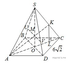 Проведем высоту пирамиды SO и рассмотрим треугольник ASC. AK и SO — его медианы, поэтому точка их пересечения M делит SO в отношении считая от S. Проведем через нее прямую, параллельную BD, и обозначим точки ее пересечения с BS и DS за U и V. Она будет лежать в плоскости BSD, и