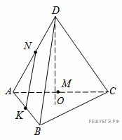 Версия для печати и копирования в MS WordВ правильном тетраэдре ABCD точки K и N середины рёбер AB и AD соответственно. Прямая DO перпендикулярна плоскости ABC. Расстояние между прямыми KN и DO равно 3. Найти площадь сечения тетраэдра проходящего через середины трёх смежных рёбер.