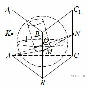 Заметим, что а сечение плоскостью MNK — равносторонний треугольник, у которого радиус вписанной окружности равен 1, откуда его сторона равна