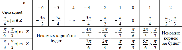 б) Отбор искомых корней с помощью единичной окружности в данном случае будет несколько неудобным из-за большого количества корней, принадлежащих заданному отрезку. (Их всего окажется 16). Поэтому отдадим предпочтение другому способу — перебору различных целых значений n для каждой серии решений.