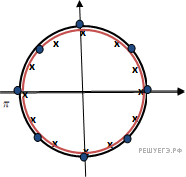 При этом будем иметь в виду, что Это — бесспорно! Однако наш ответ к задаче будет выглядеть более привлекательным, если мы все же пойдем несколько иным путем: постараемся выразить множество решений уравнения через непересекающиеся множества. С этой целью отметим кружочком на единичной окружности все точки, соответствующие серии корней