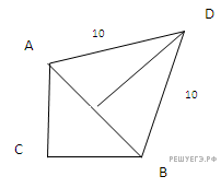 Дан треугольник АВС, в котором АС = СВ, а синус угла С равен 1. Треугольник ABD — равнобедренный, с боковой стороной равной 10. Найдите площадь треугольника АВС.