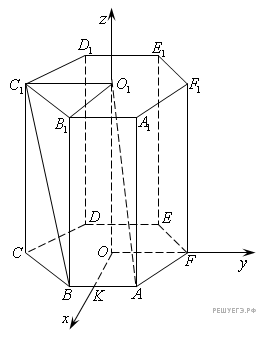 Введем декартову систему координат с началом в точке O — центре нижнего основания призмы. Ось x направим по OK, где K — середина AB, ось y — по ось z — по