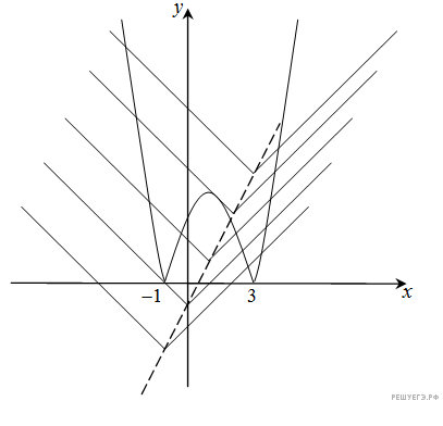 Построим графики левой и правой частей уравнения (см. рис.) Из рисунка видно, что подходящих значений a ровно два — при одном из них график правой части проходит через точку при другом — касается отраженного участка параболы.