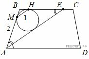 В трапеции ABCD AD || BC, AB = 2 и E — точка пересечения биссектрисы угла BAD и прямой BC. Окружность, вписанная в треугольник ABE, касается сторон AB и BE в точках M и H соответственно, MH = 1.