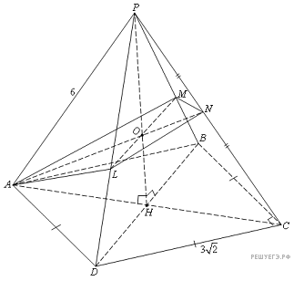 В правильной четырехугольной пирамиде PABCD боковое ребро PA = 6, а сторона основания Через вершину А перпендикулярно боковому ребру PC проведена плоскость.