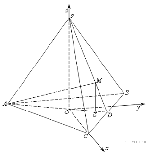 Пусть О — центр основания пирамиды, E — проекция точки M на основание пирамиды. Соединим отрезком точки А и M, M и E.