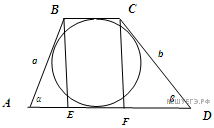 Из вершин В и С трапеции проведем перпендикуляры к AD. Их основания обозначим Е и F соответственно. Ясно, что BE = CF = 2R; Так как около окружности можно описать четырехугольник в том и только в том случае, если суммы противолежащих его сторон равны, то сумма оснований трапеции будет равна сумме ее боковых сторон, т. е. AD + BC = a + b.