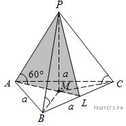 Пусть ABCP — данная правильная треугольная пирамида с вершиной P, AB = BC = AC = a, M — центр равностороннего треугольника ABC, L — середина BC, ∠PAM = ∠PBM = ∠PCM = 60°. Поскольку пирамида правильная, PM — её высота.