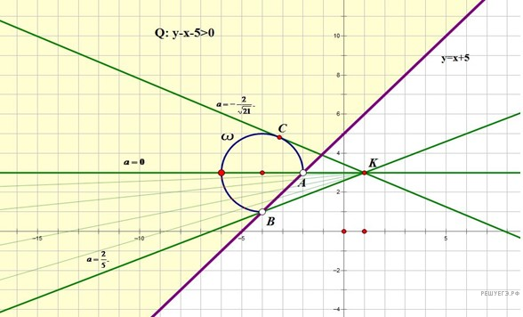 2. Прямая проходит через точку A(−2; 3). Тогда она пересечет ω в единственной точке (−6; 3). Эта ситуация наступит при a = 0, так как прямая AK окажется параллельной оси x.