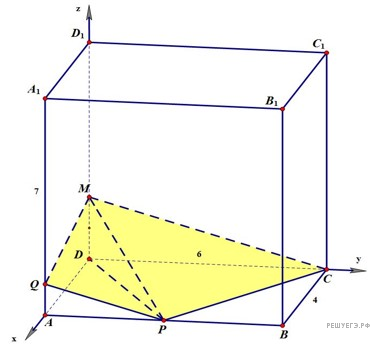В прямоугольном параллелепипеде ABCDA1B1C1D1 AB = 6, BC = 4, AA1 = 7. Точка P — середина ребра AB, точка M лежит на ребре DD1 так, что DM : D1M = 2 : 5.