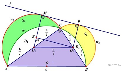 На сторонах прямоугольного треугольника ABC, как на диаметрах, построены полуокружности w, w1 и w2. (рис.).