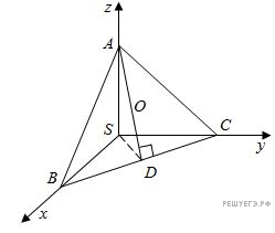 а) Поместим пирамиду в декартову систему координат с началом S, как показано на рисунке. В качестве вершины пирамиды выберем точку А.