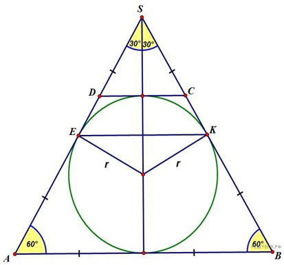 Заданная окружность будет вписанной как в трапецию ABCD, так и в Δ ASB, причем, точки E и K будут серединами отрезков AS и BS соответственно. Отсюда KE — средняя линия что и требовалось доказать.