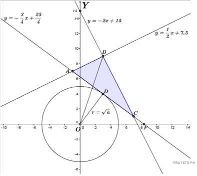 Четвертое условие исходной системы задает уравнение окружности с центром в начале координат и радиусом, равным Система будет иметь непустое решение, если найдется хотя бы одна общая точка этой окружности и части плоскости, отсекаемой от нее треугольником ABC.