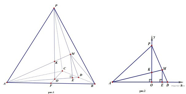 А) Пусть прямая PM пересекает BC в точке D, — проекция точки M на AD, — точка пересечения РО и AM, F — середина AB. Поместим Δ APD в декартову систему координат как показано на рис. 2. И пусть AD = 9m, PO = 3h. Тогда AO = 6m, OD = 3m, ME = h.