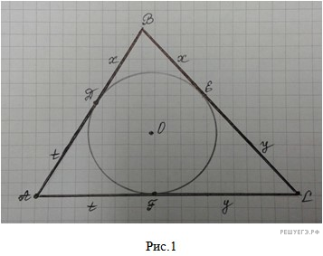 Доказательство. Пусть F, E — точки касания сторон АС и BC соответственно, Обозначим BD = BE = x, AD = AF = t, CE = CF = y. Имеем: