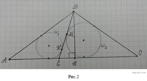 На основании AC равнобедренного треугольника ABC взята точка E. Окружности w1 и w2, вписанные в треугольники ABE и CBE, касаются прямой BE в точках K и M соответственно.