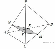 В правильной треугольной пирамиде PABC (P — вершина) точка K – середина AB, точка M — середина BC, точка N лежит на ребре АР, причем АN : NP = 1 : 3.