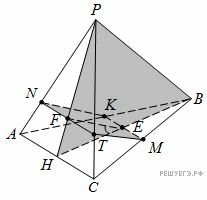 б) Пусть H — середина AC, тогда Обозначим за O центр основания пирамиды, за E и F пересечение KM и NT с плоскостью PHB соответственно, за G — проекцию точки F на плоскость ABC (очевидно, она лежит на BH). Тогда FE,