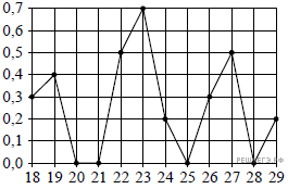 Версия для печати и копирования в MS WordНа рисунке жирными точками показано суточное количество осадков, выпадавших в Якутске с 18 по 29 октября 1986 года. По горизонтали указываются числа месяца, по вертикали — количество осадков, выпавших в соответствующий день, в миллиметрах. Для наглядности жирные точки на рисунке соединены линией. Определите по рисунку, сколько дней из данного периода выпадало от 0,1 до 0,6 миллиметров осадков.