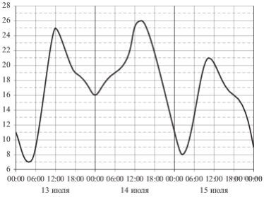 Из графика видно, что наибольшая температура воздуха 13 июля составляла 25 °C (см. рис.).