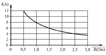 Версия для печати и копирования в MS WordМощность отопителя в автомобиле регулируется дополнительным сопротивлением, которое можно менять, поворачивая рукоятку в салоне машины. При этом меняется сила тока в электрической цепи электродвигателя — чем меньше сопротивление, тем больше сила тока и тем быстрее вращается мотор отопителя. На рисунке показана зависимость силы тока от величины сопротивления. На оси абсцисс откладывается сопротивление (в омах), на оси ординат — сила тока в амперах. Каково сопротивление цепи (в омах), если сила тока составляет 6 А?