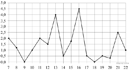 Версия для печати и копирования в MS WordНа рисунке жирными точками показано суточное количество осадков, выпадавших в Мурманске с 7 по 22 ноября 1995 года. По горизонтали указываются числа месяца, по вертикали — количество осадков, выпавших в соответствующий день, в миллиметрах. Для наглядности жирные точки на рисунке соединены линией. Определите по рисунку, сколько дней в этот период выпадало более 3 миллиметров осадков.