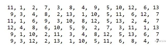 Пример расстановки, оканчивающейся числом 13: 11, 1, 2, 7, 3, 8, 4, 9, 5, 10, 12, 6, 13.