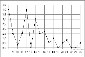 Версия для печати и копирования в MS WordНа рисунке жирными точками показано суточное количество осадков, выпадавших в Томске с 8 по 24 января 2005 года. По горизонтали указываются числа месяца, по вертикали — количество осадков, выпавших в соответствующий день, в миллиметрах. Для наглядности жирные точки на рисунке соединены линией. Определите по рисунку, сколько дней из данного периода выпадало меньше 2 миллиметров осадков.